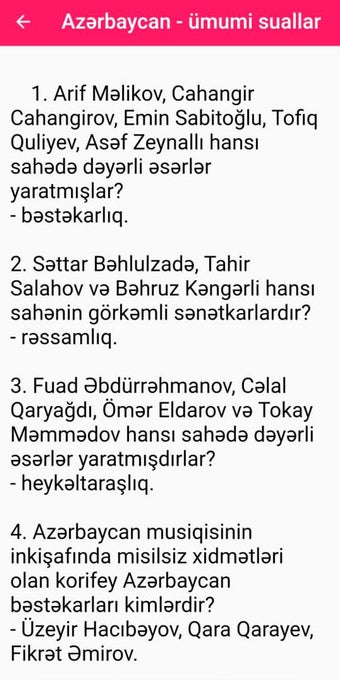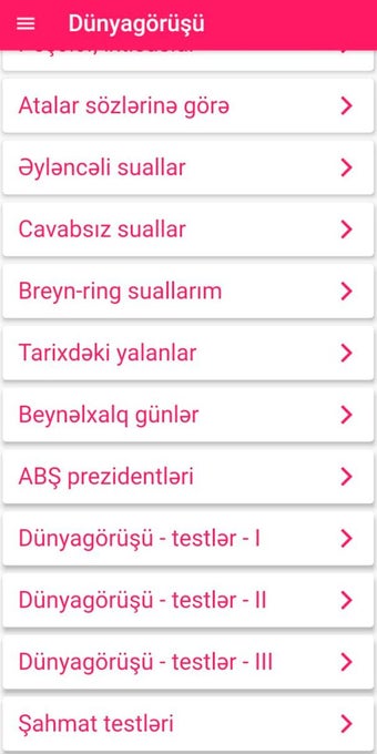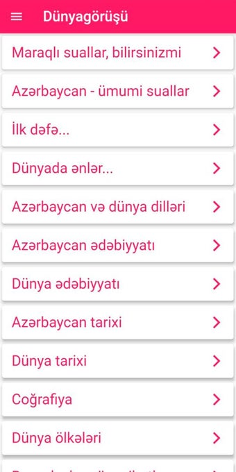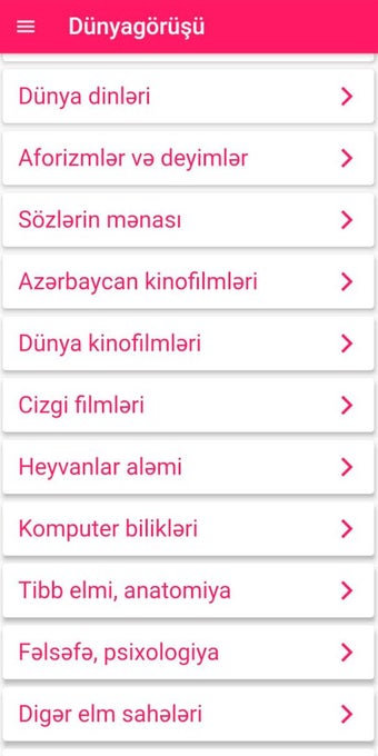 O O aplicativo Dünyagörüşü abrange importantes eventos sociopolíticos, jurídicos e socioeconômicos no mundo e na República do Azerbaijão, literatura mundial e do Azerbaijão, história, geografia, cinema, língua do Azerbaijão, constituições da República do Azerbaijão e da República Autônoma de Nakhchivan, bem como bem como química, biologia, cerca de 2.500 questões sobre anatomia, física, matemática e outras ciências, bem como informática, história de diferentes religiões, vários jogos, vida cotidiana e tradições.