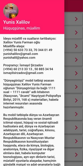 O aplicativo Dünyagörüşü é uma ferramenta educacional única que foi criada pela Instituição Pública de Desenvolvimento Social e Econômico da República do Azerbaijão. Foi desenvolvido com base nos materiais do livro “1111 perguntas e respostas” do advogado Khalilov Yunis Farman, bem como em recursos da Internet.
